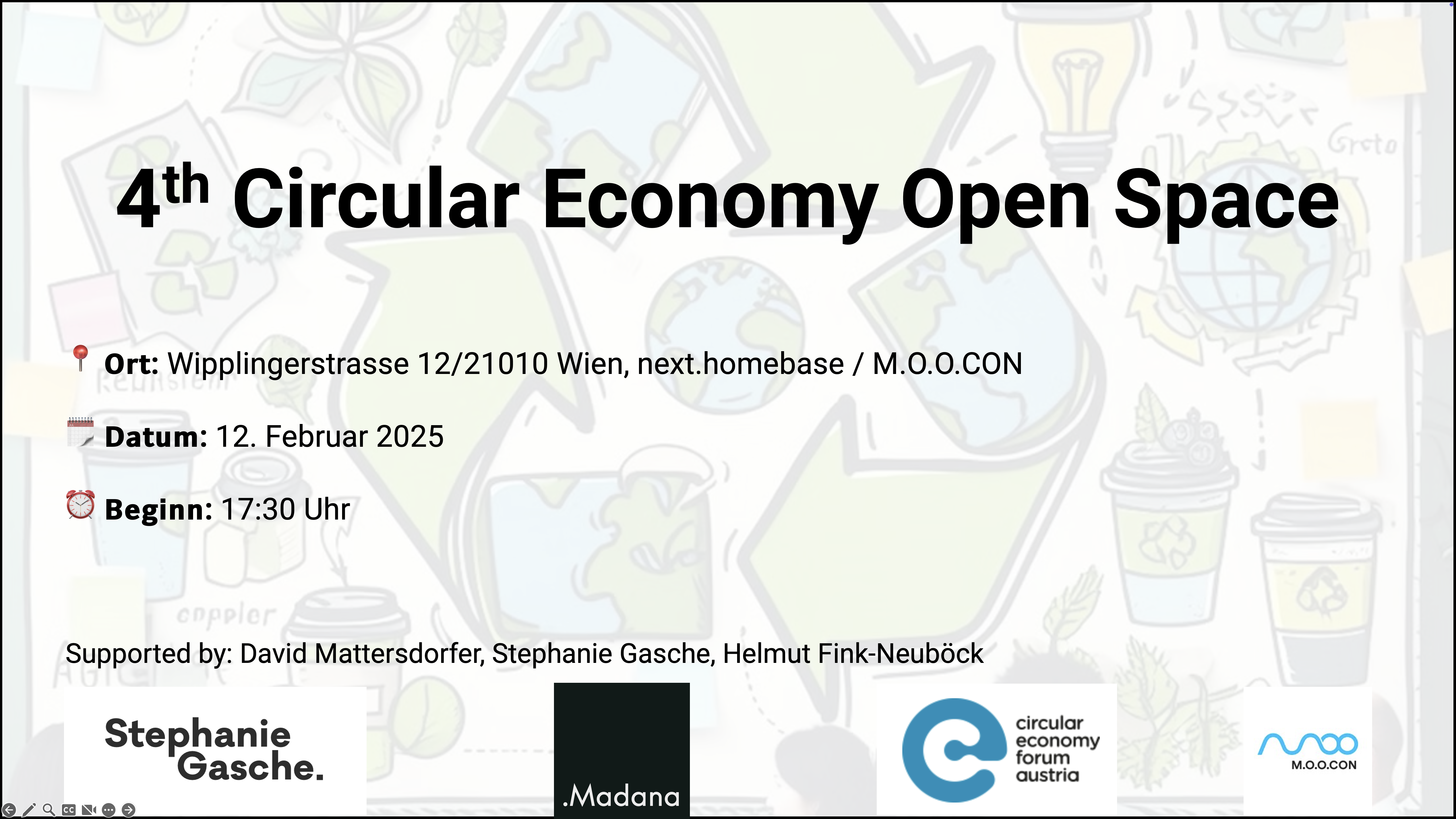 Wir möchten euch einladen zum 4. CIRCULAR ECONOMY OPEN SPACE Worum geht es? Bringe dein Thema! Das Format der Veranstaltung ist offen. Daher bestimmen die Teilnehmer, worüber gesprochen wird.“ Zum Beispiel: Zielgruppe: Wir freuen uns über Expert:Innen und solche die es noch werden wollen. Es geht darum, gemeinsame zu lernen und...